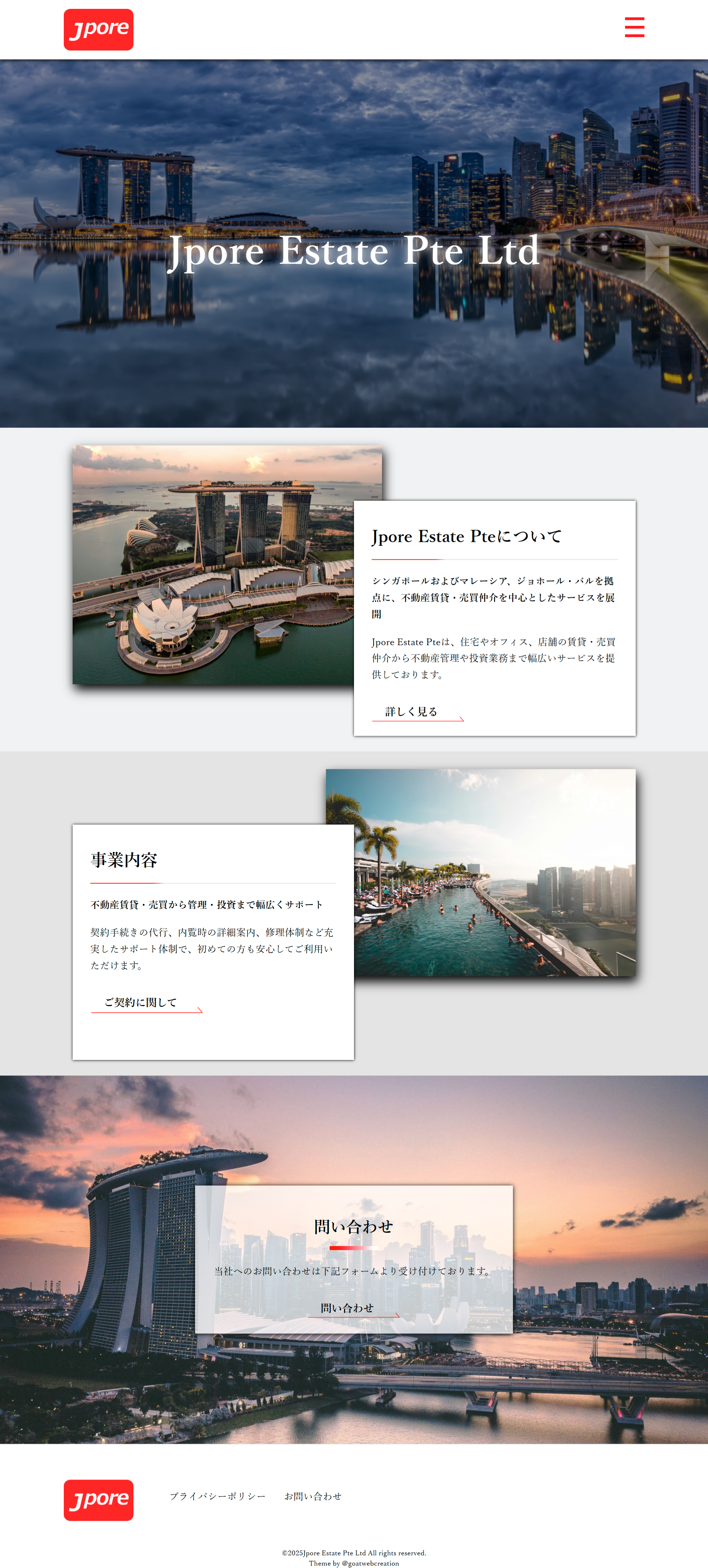 クライアント様の会社では、シンガポールおよびマレーシア、ジョホール・バルを拠点に、 不動産賃貸・売買仲介を中心としたサービスを展開しており、 シンプルな企業サイトとして信頼性と分かりやすさを重点に置いたサイト設計を行いました。